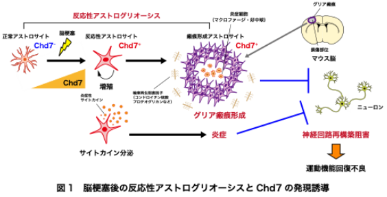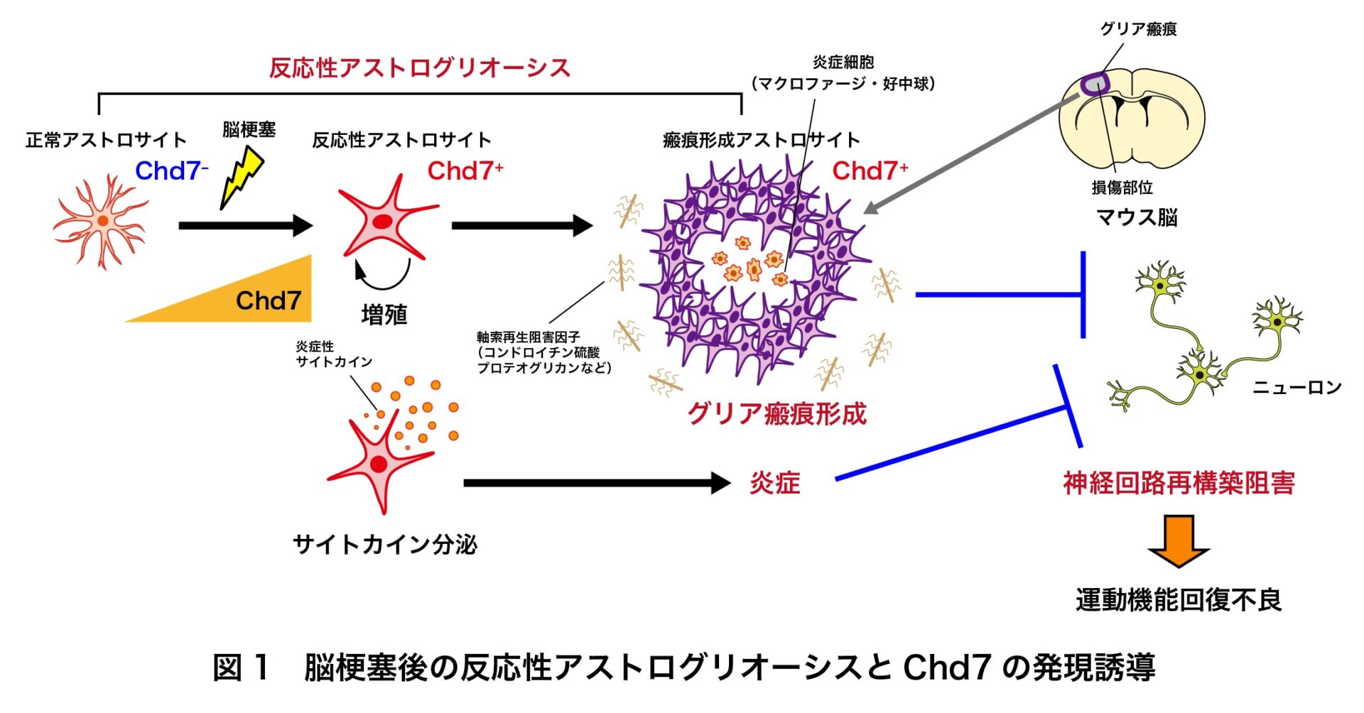 脳内のグリア細胞の1つであるアストロサイトは、神経細胞への栄養供給や血液脳関門の形成など、脳の恒常性維持に不可欠な役割を担っています1。脳梗塞などの損傷が生じると、アストロサイトは反応性アストロサイトへと変化し、増殖や形態変化、遺伝子発現変化を伴う反応性アストログリオーシスが誘導されます2。反応性アストロサイトは損傷部を隔離して炎症の拡散を防ぐグリア瘢痕を形成し、周囲の正常組織を保護するという有益な役割を担います。一方で、炎症性サイトカインを分泌して神経炎症を増悪させるほか、瘢痕形成が軸索再生を阻害して機能回復を妨げてしまうことが知られています2(図1)。これまで、この過程を制御するシグナル経路や転写因子に関する研究は数多く報告されていますが、クロマチン構造(ゲノムDNAがヒストンタンパク質に巻き付いてヌクレオソームを作り、さらに折りたたまれて細胞核内に収納された状態)が変わることで、遺伝子発現のオン/オフが調節される仕組み(エピジェネティックな制御機構)については不明な点が多く残されています3。本研究では、クロマチン構造を変化させるATP依存性クロマチンリモデリング因子Chd7に着目し、脳梗塞後の反応性アストログリオーシスにおけるその役割を明らかにしました4。