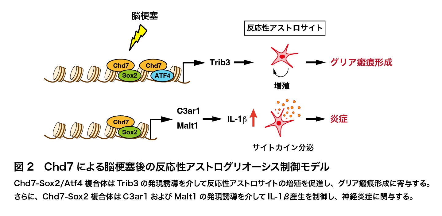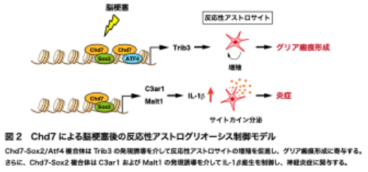 Chd7が反応性アストログリオーシスを制御する分子メカニズムを解析しました。Chd7はSox2やAtf4と直接結合して複合体を形成します。この複合体はTrib3遺伝子のプロモーター領域に結合し、Trib3の発現を誘導することでアストロサイトの増殖を促進します。さらに、Chd7-Sox2複合体はC3ar1およびMalt1遺伝子の発現を制御し、炎症性サイトカインであるIL-1βの産生を誘導することで神経炎症に関与することがわかりました(図2)。